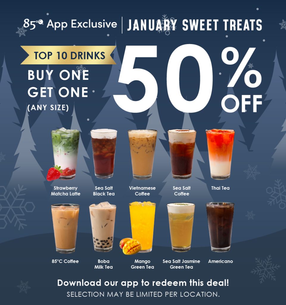*Reward valid for One (1) Buy One Get One 50% OFF the Top 10 Drinks listed: (Strawberry Matcha Latte, Sea Salt Black Tea, Vietnamese Coffee, Sea Salt Coffee, Thai Tea, 85°C Coffee, Boba Milk Tea, Mango Green Tea, Sea Salt Jasmine Green Tea, Americano). Available only on the 85°C app. No exchanges. No reward points are required for this coupon. Valid from 1/1/2026 to 1/31/2026. Must be redeemed in-store before 11:59pm PST on date of expiry. Offer valid in-store or via online ordering once logged into your 85°C APP account. Cannot be combined with any other offers or discounts. While supplies last.