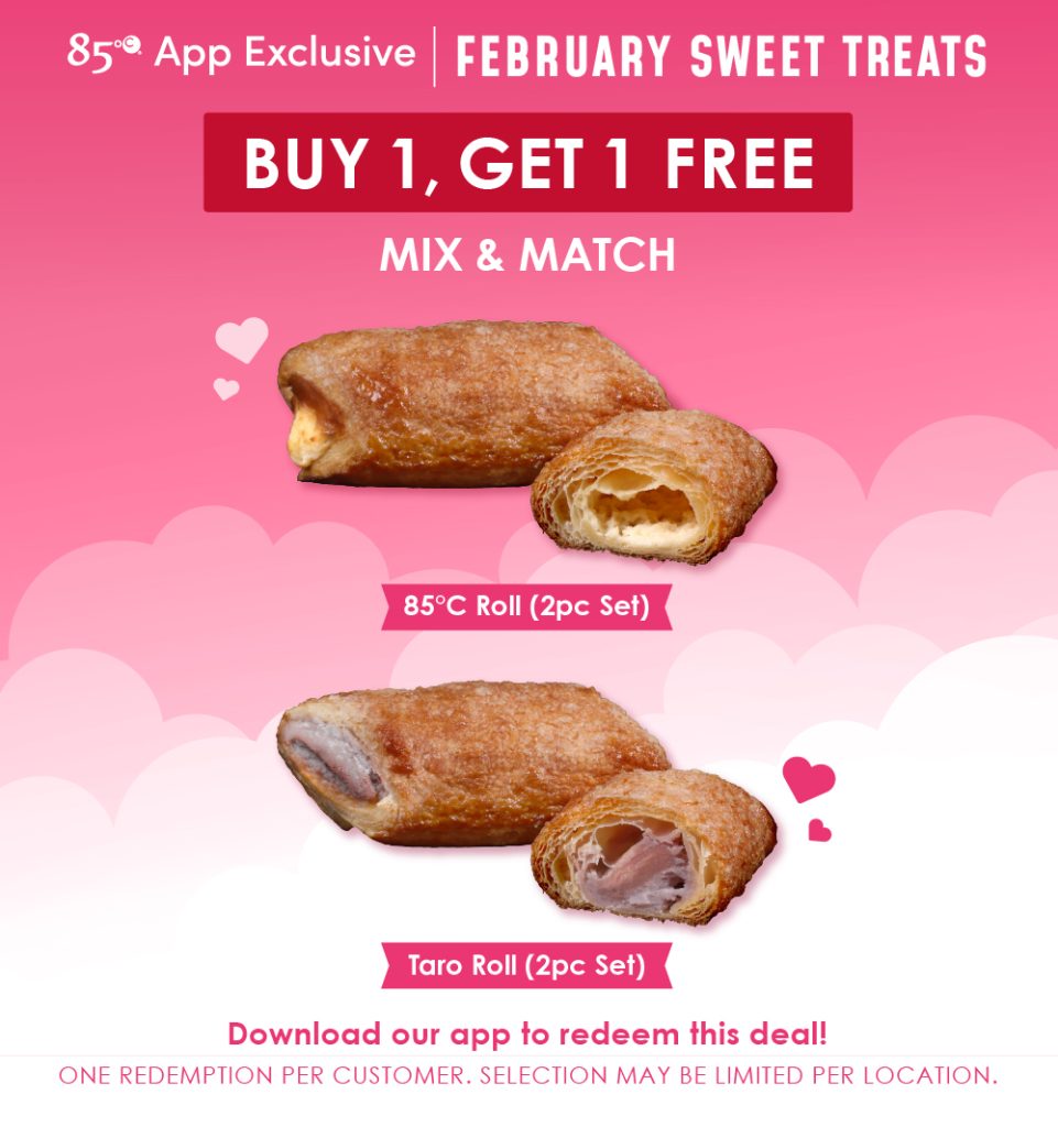*Reward valid for One (1) Buy One Get One FREE for the products listed: (85°C Roll (2pc set), Taro Roll (2pc set). Available only on the 85°C app. No exchanges. No reward points are required for this coupon. Valid from 2/1/2026 to 2/28/2026. Must be redeemed in-store before 11:59pm PST on date of expiry. Offer valid in-store or via online ordering once logged into your 85°C APP account. Cannot be combined with any other offers or discounts. While supplies last.