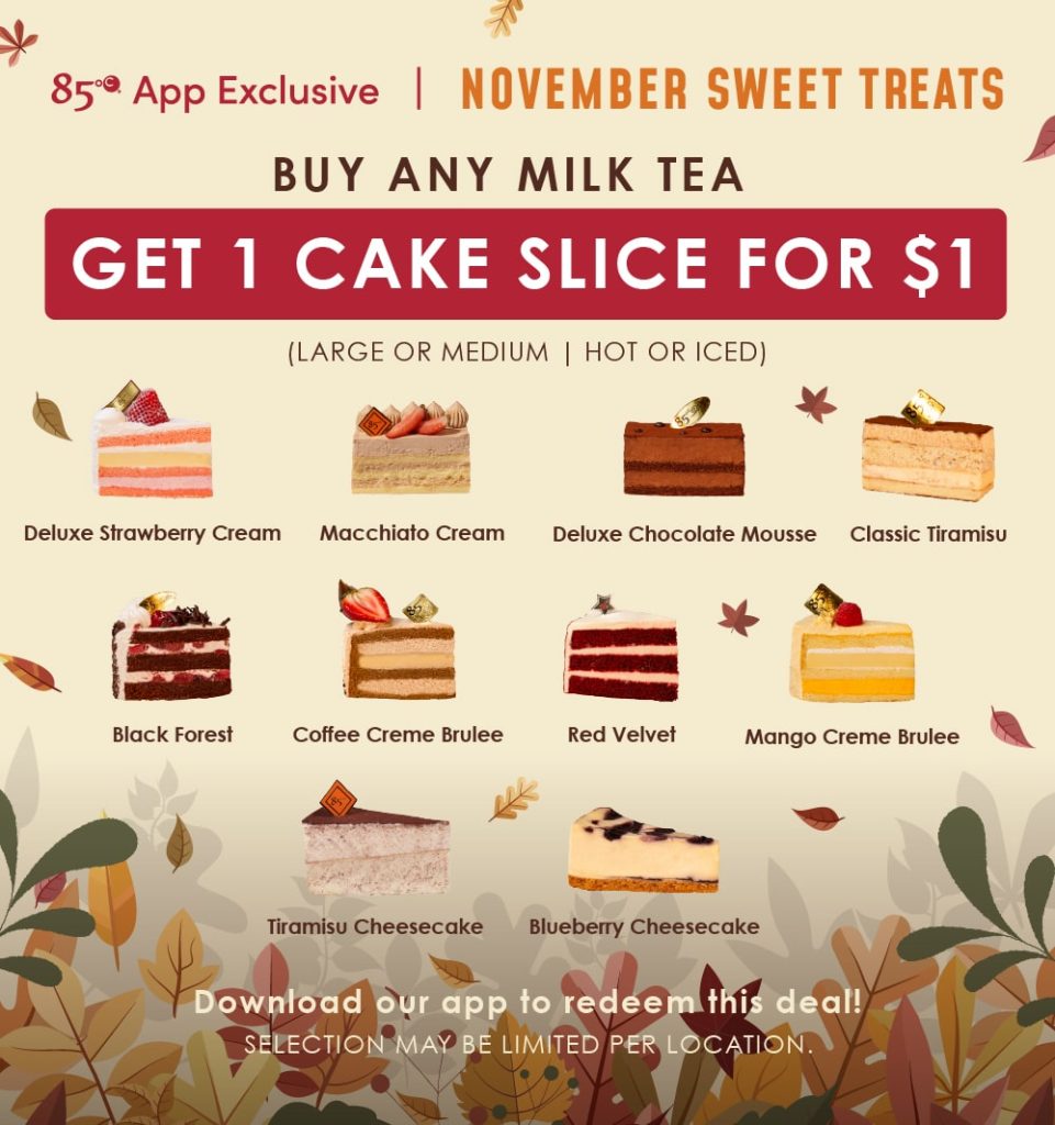 *Reward valid for Buy 1 Milk Tea (Any Size) Get 1 Cake Slice for $1. Cake Slices Listed: (Deluxe Strawberry, Macchiato Cream, Deluxe Chocolate Mousse, Classic Tiramisu, Black Forest, Coffee Creme Brulee, Red Velvet, Mango Creme Brulee, Tiramisu Cheesecake, and Blueberry Cheesecake). Available only on the 85°C app. No exchanges. No reward points are required for this coupon. Valid from 11/1/2025 to 11/30/2025. Must be redeemed in-store before 11:59pm PST on date of expiry. Offer valid in-store or via online ordering once logged into your 85°C APP account. Cannot be combined with any other offers or discounts. While supplies last.